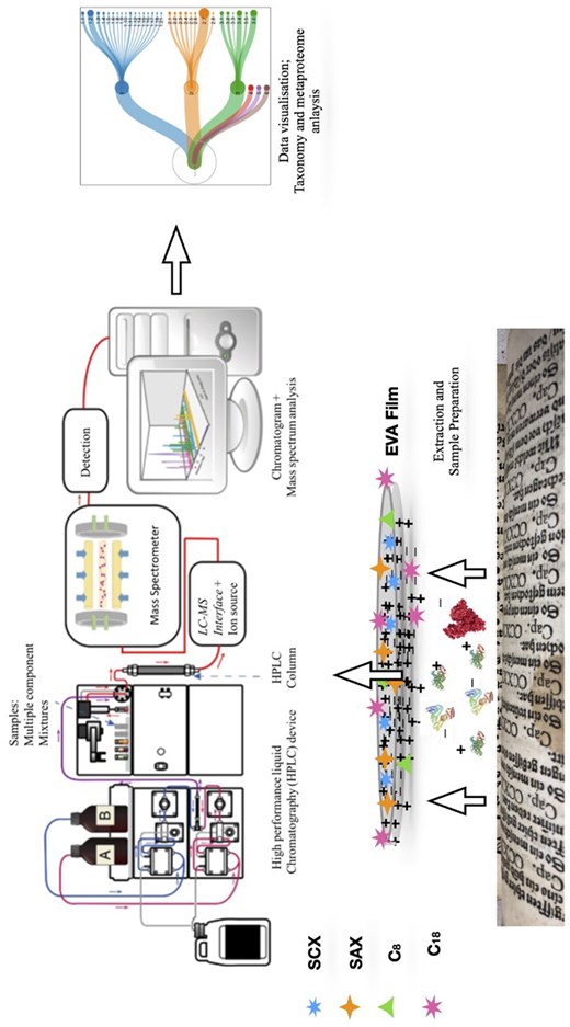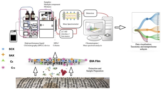 そして、研究チームは回収した成分に含まれる混合物を分けて、分子の重さの特徴から正体を推定する液体クロマトグラフィー–質量分析法を実施しました。タンパク質は大きいので、解析ではアミノ酸が短く連なった断片であるペプチドとして扱い、その情報から由来するタンパク質を推定したとのこと。以下の画像はEVAで回収した成分を解析し、データとして整理する流れを示しています。
