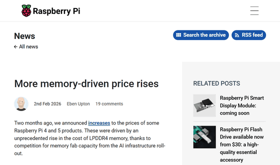 Raspberry Piは今回の値上げについて、「2026年はメモリ価格にとって再び厳しい年になりそうですが、我々は影響を最小限に抑えるよう尽力しています。以前にも説明した通り、現在の状況はあくまで一時的なものであり、状況が落ち着き次第、これらの値上げを解消したいと考えています」と説明しました。