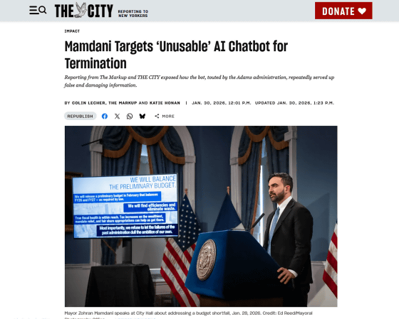 アメリカのニューヨーク市は2023年、Microsoft製のチャットボットである「MyCity Chatbot」を市のポータルサイトで公開し、問題を抱える事業主への質問にMyCity Chatbotが答える取り組みを始めました。ところが、MyCity Chatbotは正確性に欠ける回答が多いことが指摘されており、2026年1月に就任した新市長のゾーラン・マムダニ氏はチャットボットの廃止を計画していることが判明しました。
