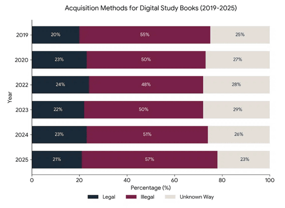デンマークの調査会社・Epinionが2025年に実施した調査では、デジタル教科書を使用している学生のうち少なくとも57%が違法に入手していることが判明しました。以下はデジタル教科書を使用している学生のデータを年ごとにグラフにしたもので、紺色が正規のデジタル教科書、赤色が違法なデジタル教科書、白色が不明ですが、違法なデジタル教科書の割合が前年より拡大していることが分かります。