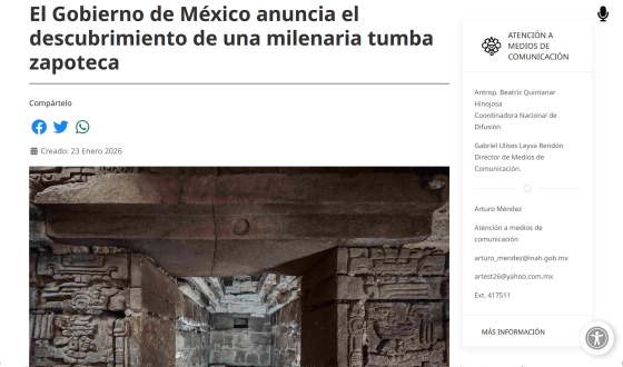 現地時間の2026年1月23日、メキシコの国立人類学歴史研究所(INAH)が西暦600年頃に建設されたサポテカ文明の墓の遺跡を発見したと報告しました。遺跡は建造物がかなり良好な状態で保存されている上に、巨大なフクロウの彫刻なども残されており、サポテカ文明について知る貴重な手がかりになると期待されています。