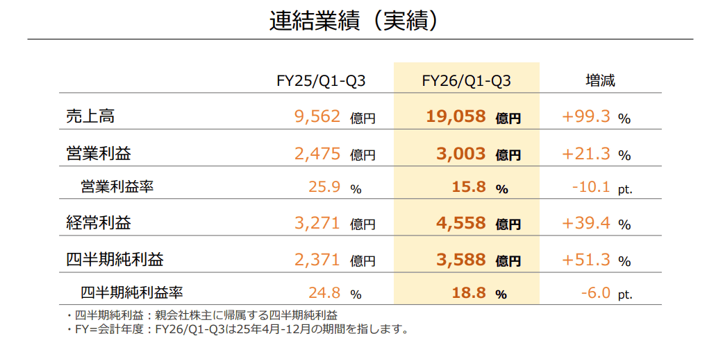 任天堂の2026年第3四半期の売上高は前年同期比で99.3%減の1兆9058億円、営業利益は前年同期比で21.3%増の3003億円、経常利益は前年同期比で39.4%増の4558億円、四半期純利益は前年同期比で51.3%増の3588億円でした。