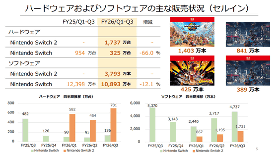 2025年6月5日に登場した任天堂の次世代家庭用ゲームハード「Nintendo Switch 2」の販売台数は1737万台で、ゲームソフト販売本数は3793万本。また、「Nintendo Switch」が登場した後も「Nintendo Swtich」は前年同期比で66%減少しつつも売れ続けており、2026年第3四半期の販売台数は325万台となっています。