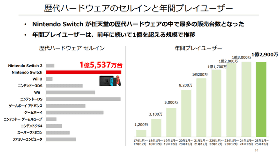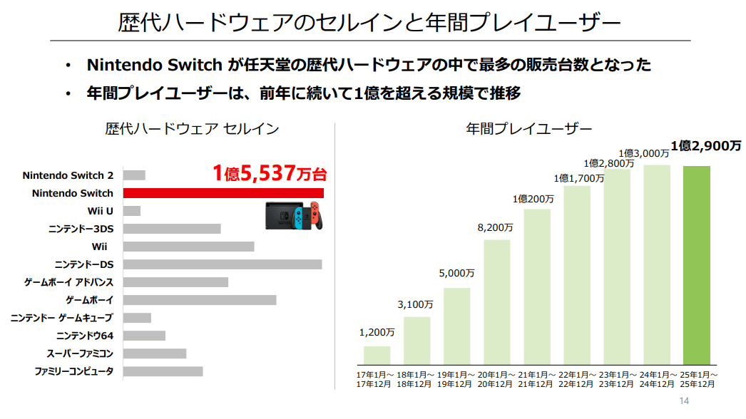 「Nintendo Swtich」の累計販売台数は2025年12月末時点で1億5537万台を記録し、ニンテンドーDSが記録していた1億5402万台を超えて「任天堂の歴代ハードウェアの中で最多の販売台数」になったことも発表されました。