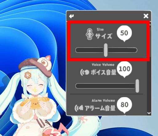 雪ミクをクリックしたりマウスポインタで頭をなでたりするとボイスとモーションで反応してくれます。また、雪ミクをウィンドウ枠の近くにドラッグするとウィンドウに腰掛けてくれます。実際のボイスやモーションは以下の動画で確認できます。