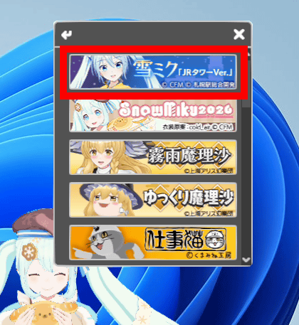 「雪ミク SNOW MIKU 2026 Ver.」と「雪ミク JRタワー Ver.」はどちらも税込2200円の有料DLCとして販売されています。Steamの販売ページでDLCを購入したら、Desktop Mateの右クリックメニュー内にある「キャラクター変更」をクリック。
