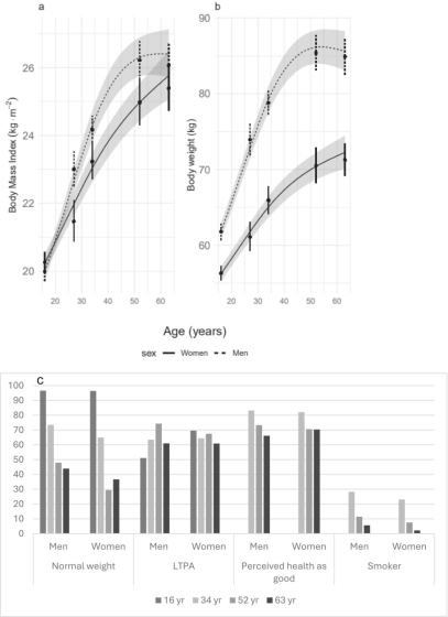 身体能力は体格や生活習慣の変化と切り離せないため、研究チームは能力の推移とあわせてBMI・体重の年齢推移、年齢時点ごとの標準体重の割合、余暇の身体活動(LTPA)、健康状態の自己評価、喫煙の割合も調べました。下のグラフ群は各要素についての経時的な変化をまとめたものです。なお、グラフの実線が女性、点線が男性、灰色の帯は推定の幅を表しています。