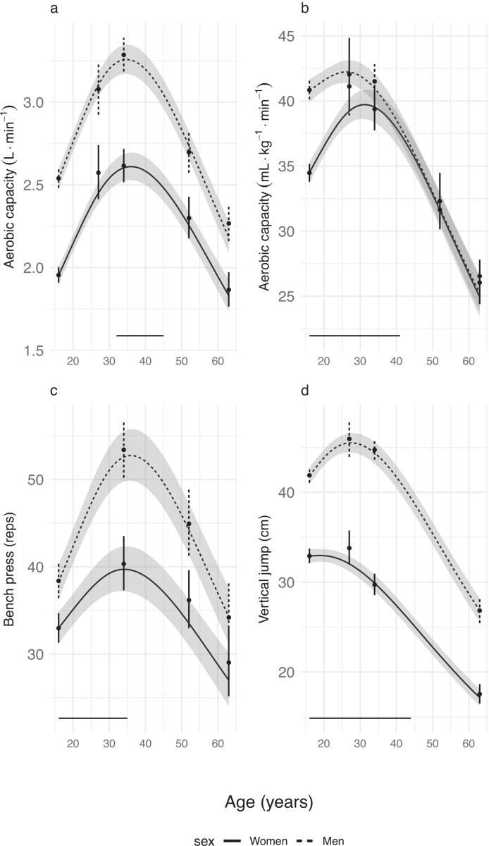 分析の結果、筋持久力と推定最大有酸素能力については性差はそれほどなく、26歳~36歳でピークに達した後、当初は年0.3%~年0.6%程度で低下し、その後は年2.0%~年2.5%程度まで低下が加速したと研究チームは報告しています。ただし、瞬発力についてはピークとなるタイミングが異なり、男性は27歳、女性は19歳でピークに達しその後は当初年0.2%~年0.5%程度で低下、のちに年2%以上へと低下が加速したとのこと。