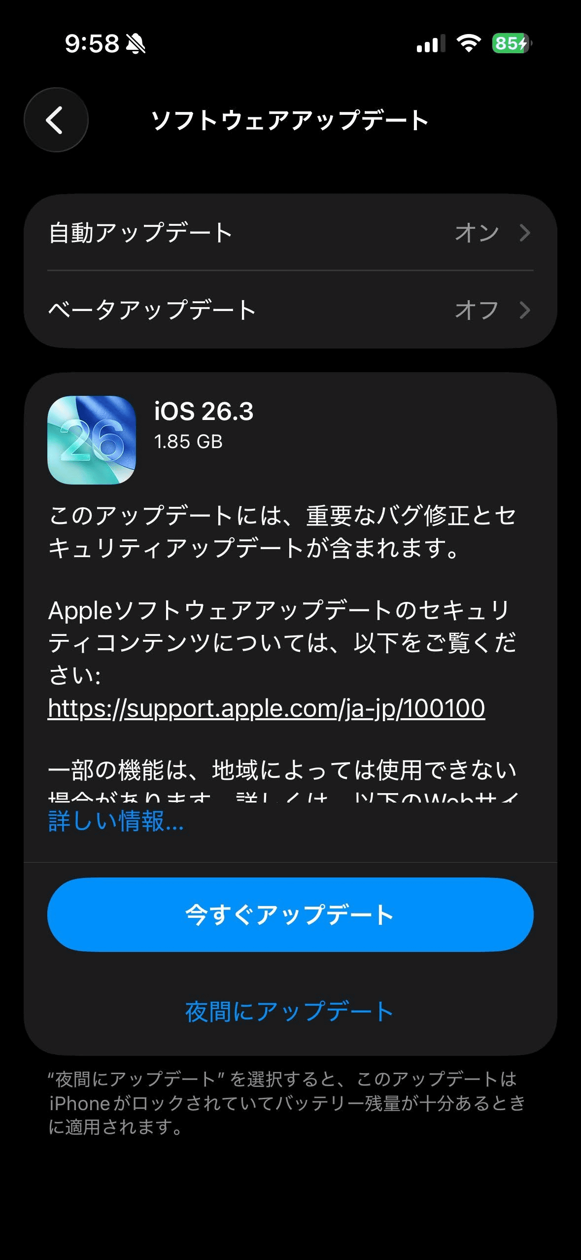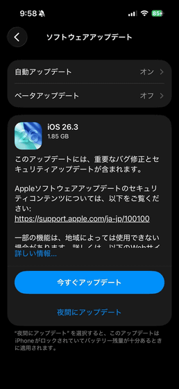 「設定」アプリの「一般」→「ソフトウェアアップデート」から「iOS 26.3」へのアップデートが可能。ファイルサイズは1.85GBです。