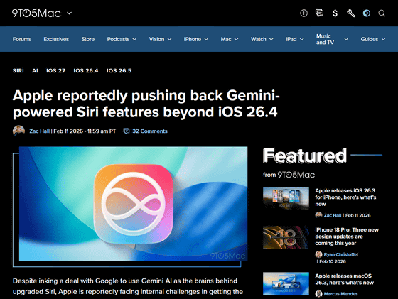 AppleはパーソナルAIの「Apple Intelligence」の英語版を2024年10月に、日本語版を2025年4月にリリースしました。AppleはこのApple Intelligenceを生成AIで強化することをもくろんでおり、2026年1月にはGoogleのGeminiを使う複数年契約を締結しています。このGeminiで強化されたSiriはiOS 26.4でついに登場すると目されていたのですが、これがiOS 26.4以降に延期される可能性が報じられました。