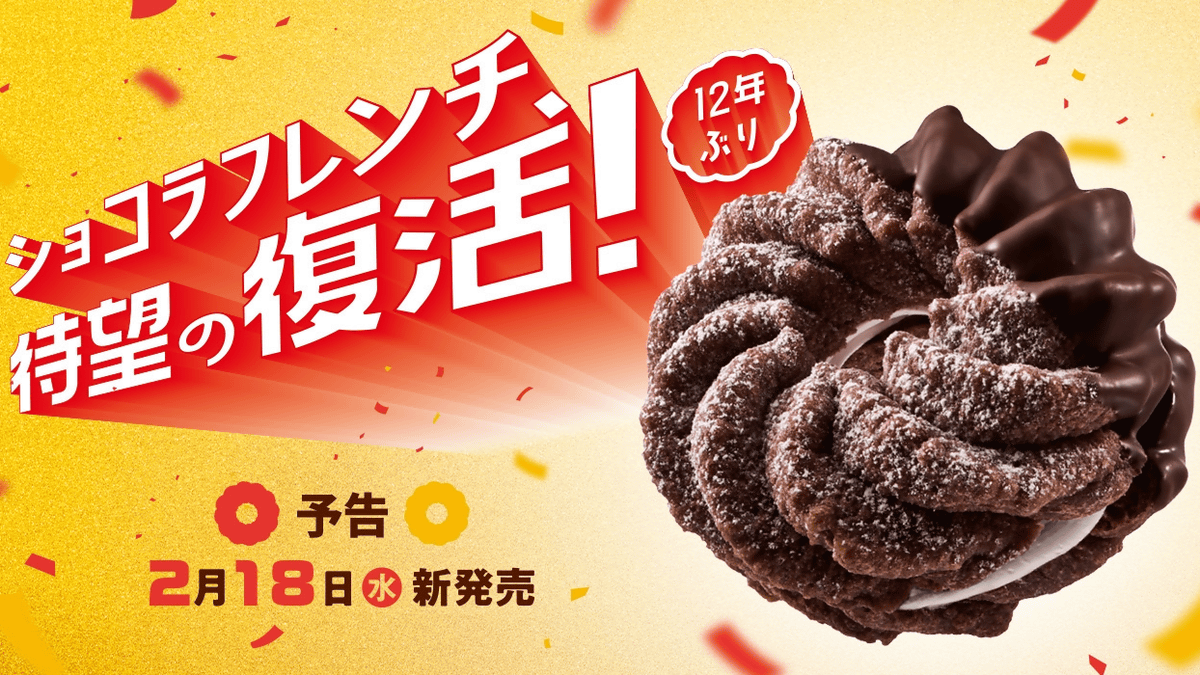 ミスタードーナツが創業55周年を記念して、販売終了から12年が経過した「ショコラフレンチ」シリーズ全3種を2026年2月18日(水)から期間限定で発売します。価格はいずれも税込で、「ショコラフレンチ」がテイクアウト183円・イートイン187円、「エンゼルフレンチ」がテイクアウト194円・イートイン198円、「ザクザクチョコクリームショコラ」がテイクアウト205円・イートイン209円です。