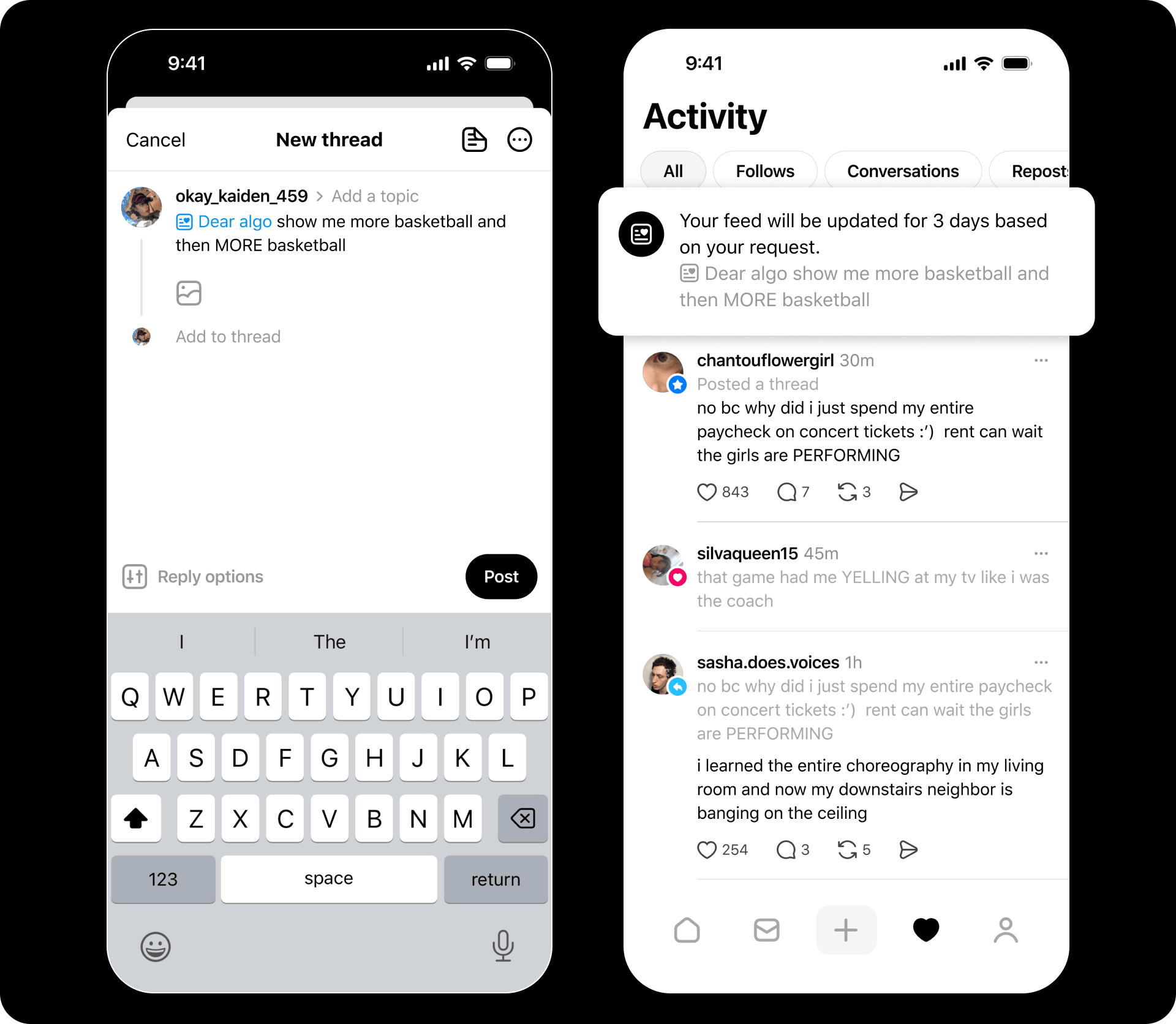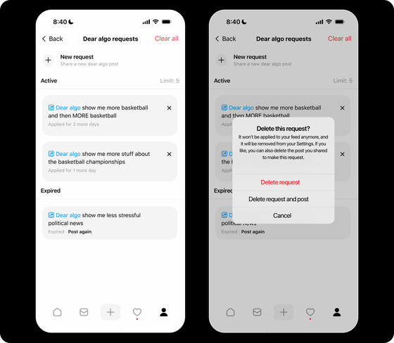 一度リクエストを共有すると、その後3日間にわたってフィードの内容がユーザーの要望に基づいて更新され、最新の話題を追いかけられるようになります。さらに、自分自身でリクエストを投稿するだけでなく、他人のDear Algo投稿をリポストすることで、その人の設定した好みを自分のフィードに適用し、新しい会話を発見することも可能です。