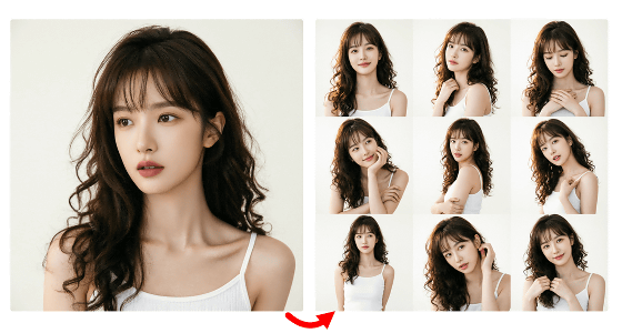 編集タスクも実行可能です。以下の例では1枚のポートレートを入力して9枚の別ポーズ画像を生成しています。