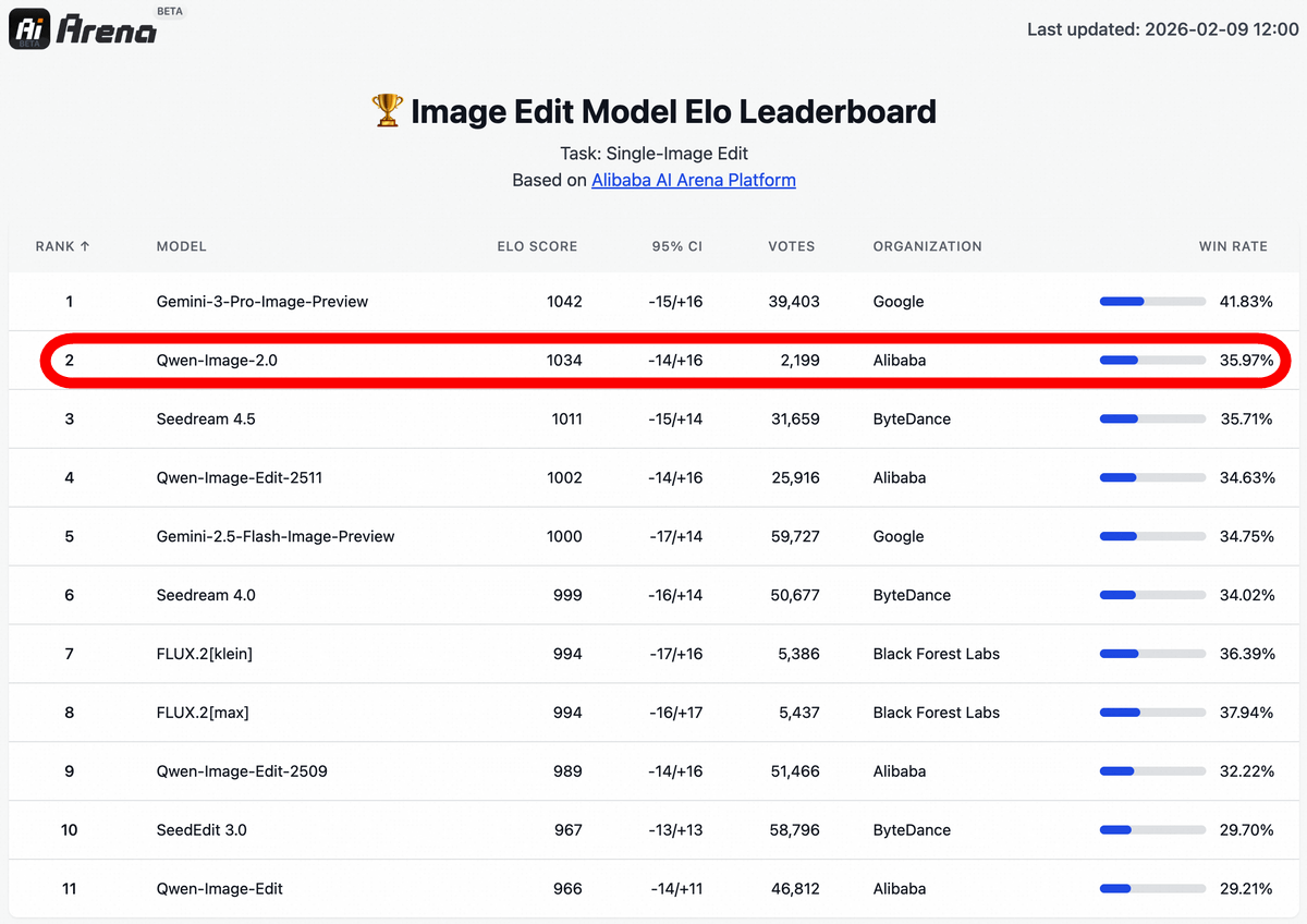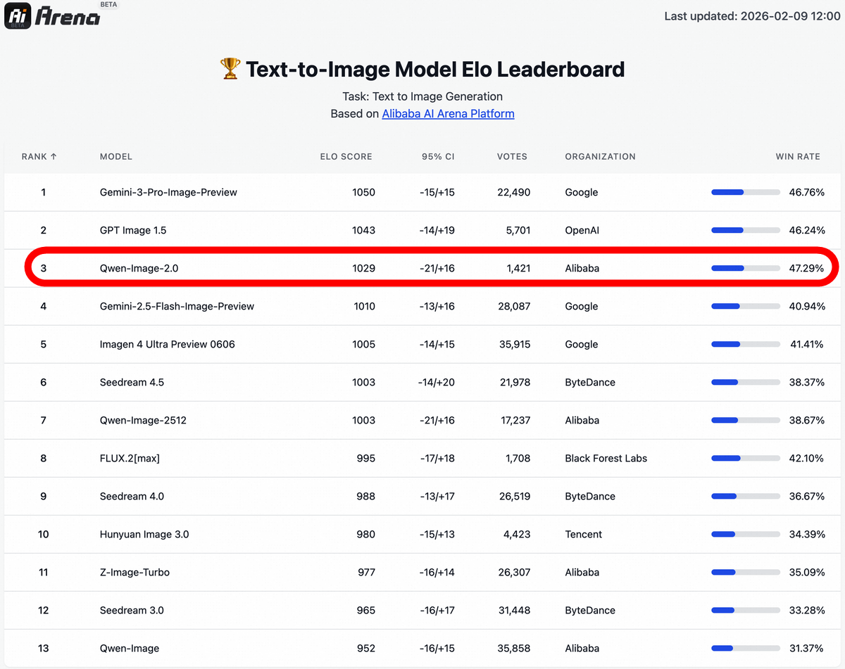 Qwen-Image-2.0は既存のQwen-Imageシリーズと比べて生成画像の品質が向上しています。Alibabaが運営するAIブラインドテストサービス「AI Arena」では、テキストから画像を生成タスクにおいてGemini-2.5-Flash-Image-Preview(Nano Banana)を上回っています。