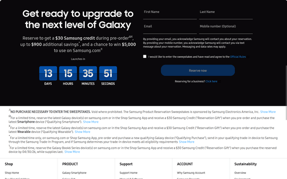 なお、Samsungは既にGalaxyスマートフォンの予約購入を受付中で、予約すると30ドル分(約4600円)のクレジットを受け取れるほか、Samsung.comで使用できる5000ドル分(約76万1900円)のギフトカードが当たるチャンスに応募できます。