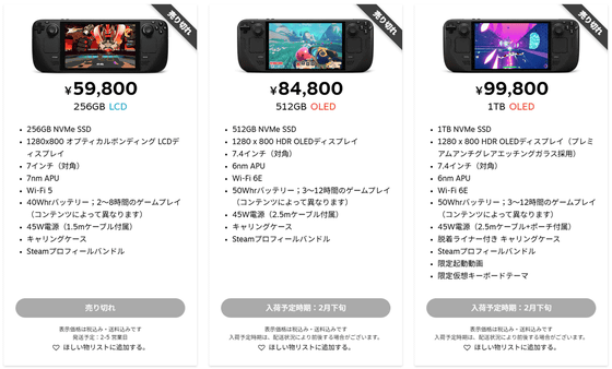 確認したところ、確かに3種類のモデルがいずれも「売り切れ」となっていました。ただし、512GBモデルと1TBモデルは2月下旬に入荷予定となっています。
