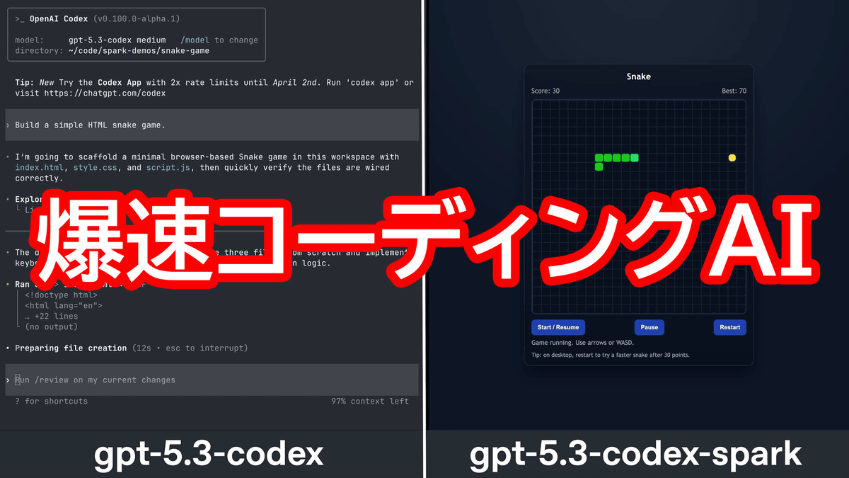 以下のポストにはGPT-5.3-Codex(左)とGPT-5.3-Codex-Spark(右)でスネークゲームの開発にかかる時間を比較した動画が埋め込まれています。GPT-5.3-Codexが開発完了までに40秒以上を要したのに対してGPT-5.3-Codex-Sparkは約9秒でプレイ可能なスネークゲームを生成することに成功しました。