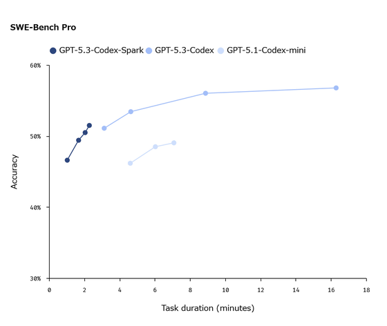 GPT-5.3-Codex-Sparkはただ高速なだけでなく、タスク実行性能の高さも特徴です。以下のグラフは「GPT-5.3-Codex-Spark」「GPT-5.3-Codex」「GPT-5.1-Codex-mini」の性能を比較したもので、横軸がタスクに費やす時間、縦軸が正確性を示しています。GPT-5.3-Codex-SparkはGPT-5.1-Codex-miniより高速かつ正確な処理が可能であることが分かります。
