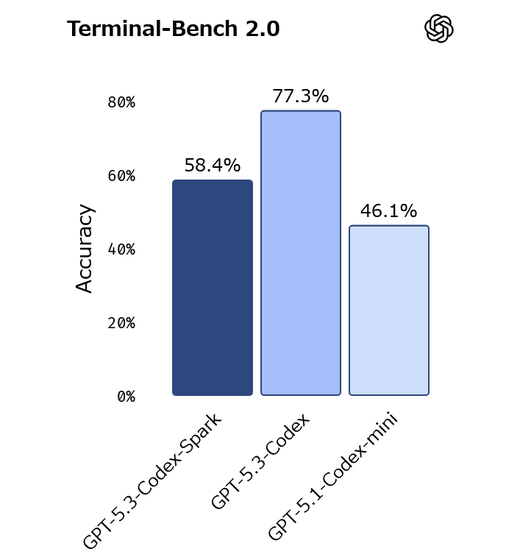 AIのエージェント性能を測定するTerminal-Bench 2.0でもGPT-5.3-Codex-SparkがGPT-5.1-Codex-miniを上回っています。