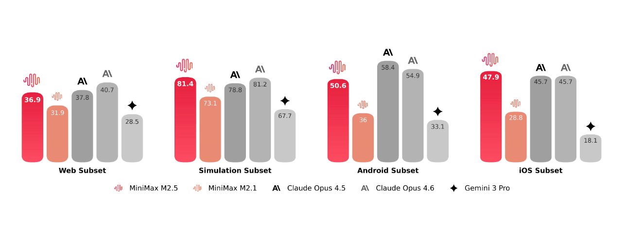 また、Python、Java、Rust、Goを含む10種類以上の言語に対応し、20万を超える実世界の環境で学習したとした上で、開発環境のセットアップからシステム設計、機能の反復、そして最終的なコードレビューとテストに至る開発ライフサイクルの全工程をカバーできるとMinimaxは説明しています。また、ウェブ、Android、iOS、Windowsといった複数のプラットフォームに対応したフルスタックプロジェクトの遂行も可能です。
