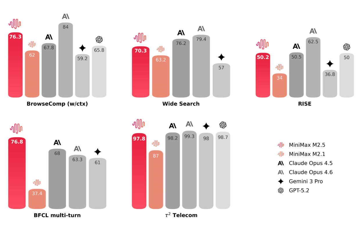 さらに、M2.5はエージェントが複雑なタスクを自律的に処理するための基盤となる検索およびツール呼び出し能力が大幅に強化されたとのこと。M2.5は前世代のM2.1と比べ、BrowseCompやWide Search、RISEといった複数のエージェントタスクで、探索のラウンド数を約20%減らしつつより良い結果を出したとしており、正答だけでなく効率的な経路で結論に到達する方向に推論が改善しています。また、BrowseCompやWide Searchなどのベンチマークで業界トップ級の性能を達成したとした上で、未知の環境でも安定して性能を出せる一般化性能が向上したとMinimaxは説明しています。