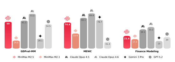 M2.5は実際の職場環境で即戦力となる成果物を出力することを目指して開発されています。金融、法律、社会科学の専門家と緊密に連携し、彼らの業界知識を学習パイプラインに取り入れることで、WordやPowerPoint、Excelを用いた財務モデリングなどの高価値な業務シナリオで顕著な改善を実現しているとのこと。社内の評価フレームワークであるGDPval-MMでは、他の主要なモデルに対して平均59.0%の勝率を記録しています。さらに、Excelのeスポーツ大会であるMEWCの問題を用いた評価でも、複雑な表計算やツール利用において優れた能力を発揮することが証明されています。