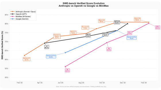 以下はMinimax Mシリーズ(ピンク)のSWE-Bench Verifiedのスコア推移をAnthropic Claude(オレンジ)とOpenAIのGPT(黒)、GoogleのGemini(青)と比較したグラフ。