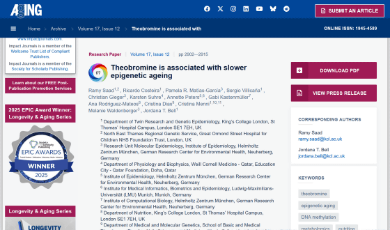 分析の結果、チョコレートやコーヒーに含まれている「テオブロミン」という化学物質の濃度が高い人は、生物学的老化が遅い兆候を示すことが明らかになりました。