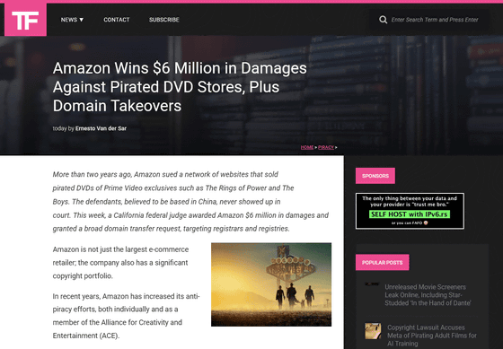 Amazonの子会社であるAmazon Technologiesは2023年にAmazonプライム・ビデオで独占配信している作品をDVDで販売する複数の海賊版サイトに対して訴訟を起こしました。裁判の結果、Amazonの申し立てが全面的に認められ、海賊版サイト閉鎖のためのドメインの停止と総額600万ドル(約9億円)の損害賠償が認められました。