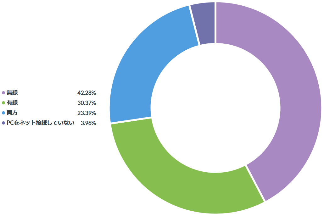 まず「いつも使用しているPCのネット接続は有線ですか?無線ですか?」と質問した結果、無線接続と回答した人が42.28%で最多でした。一方で有線接続と答えた人は30.37%で、無線と有線を使い分けているという人は23.39%。PCをネット接続していないという人は全体の3.96%にとどまりました。