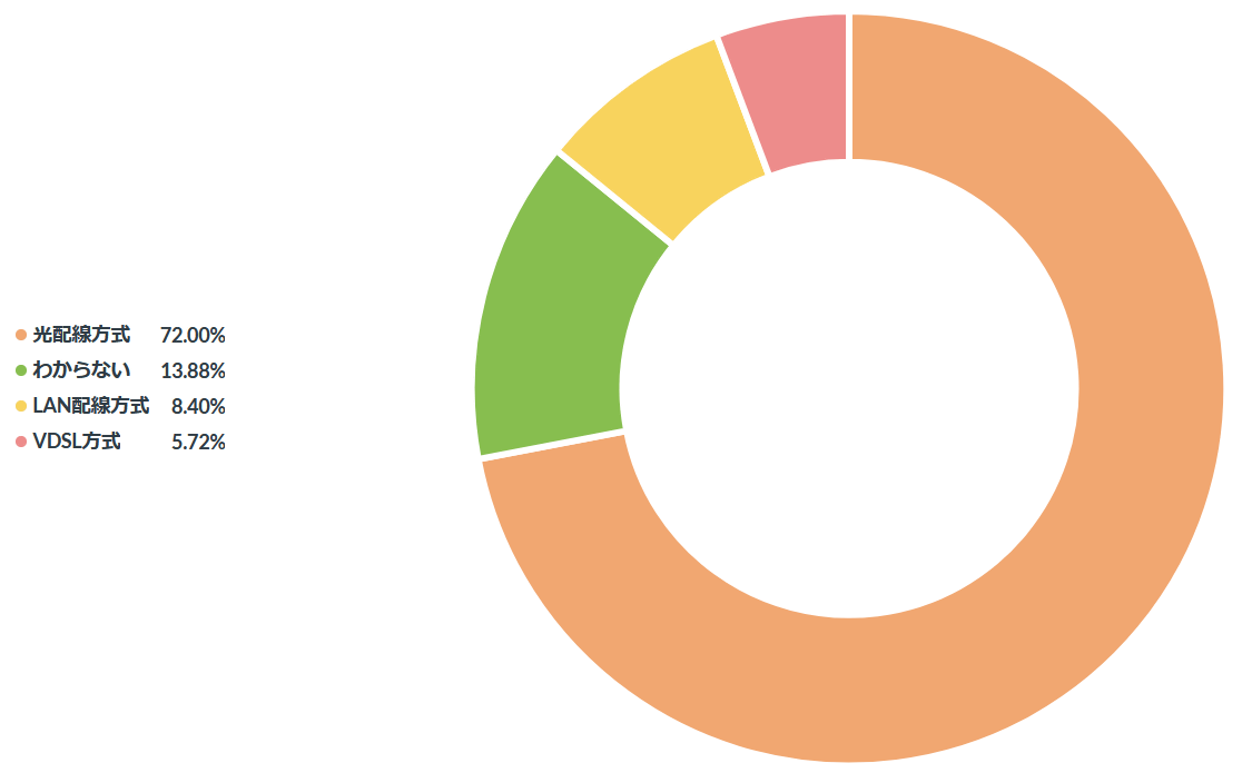 「利用している回線の配線方式は何ですか?」という質問では、光配線方式が72.00%で大きな割合を占めていることが分かりました。配線方式が「わからない」という回答も13.88%あり、配線方式までは細かく把握していない人もいるようです。なお、LAN配線方式は8.40%、VDSL方式は5.72%でした。