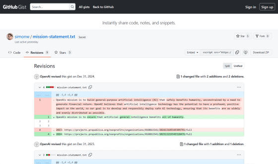 そんなOpenAIのミッションステートメントの内容が、年を追うごとに変化していることが指摘されています。ソフトウェアエンジニアのサイモン・ウィリソン氏はOpenAIのミッションステートメントをGithub Gistで公開し、年ごとの変化をチェックできるようにしています。