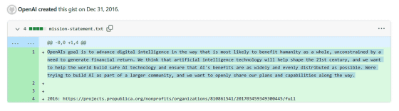 2016年に提出された最初のミッションステートメントには、「OpenAIの目標は財務的リターンの必要性に縛られることなく、人類全体にとって最も有益な方法でデジタル知能を進歩させることです。AI技術が21世紀を形作る一助となると考え、世界が安全なAI技術を構築し、AIの恩恵が可能な限り広く均等に分配されるよう支援したいと考えています。私たちはより大きなコミュニティの一員としてAIを構築しようとしており、その過程で計画と能力をオープンに共有したいと考えています」と記されています。