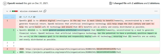 また、2020年には「人類全体にとって最も有益な方法で」という文言から「全体にとって」という表現が省かれ、2021年には「汎用(はんよう)人工知能(general-purpose artificial intelligence)」という文言が初めて登場。