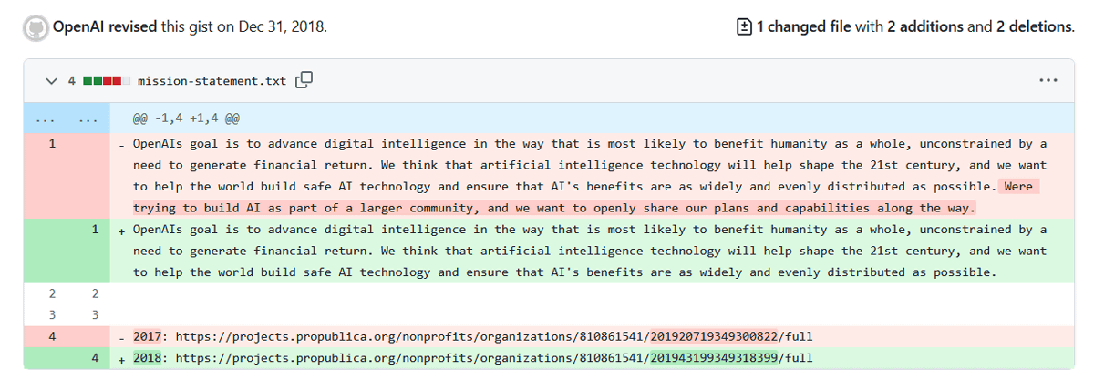 そんなOpenAIのミッションステートメントの内容が、年を追うごとに変化していることが指摘されています。ソフトウェアエンジニアのサイモン・ウィリソン氏はOpenAIのミッションステートメントをGithub Gistで公開し、年ごとの変化をチェックできるようにしています。