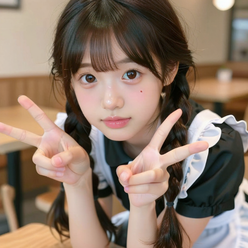 A high-resolution ultra-detailed photorealistic portrait of a young East Asian girl indoors, with fair smooth skin and a natural soft glow, large round dark brown eyes with clear reflections, subtle under-eye softness, a small delicate nose, light pink slightly glossy lips, and a gentle innocent expression, featuring a tiny beauty mark on her cheek for realism. She has dark brown shiny hair styled into two long thick braided pigtails falling over her shoulders, with slightly loose braids showing individual strands, wispy straight bangs softly covering her forehead, and a few natural flyaway hairs. She is wearing a maid clothes. Her pose is playful and casual, head slightly tilted toward the camera, leaning forward, both hands raised near the frame making a peace sign, creating a friendly and intimate feeling. The background is a cozy modern cafeteria with a wooden table and chair, softly blurred with shallow depth of field. Soft warm indoor lighting evenly illuminates her face, no harsh shadows, highlighting skin texture and hair shine. Shot with a high-end DSLR or mirrorless camera, 50mm lens, f/1.8, cinematic bokeh, sharp focus on the face, natural color grading, high dynamic range, realistic proportions, Japanese/Korean portrait photography aesthetic, cozy winter vibe, candid snapshot feeling, extremely detailed, 8k quality.