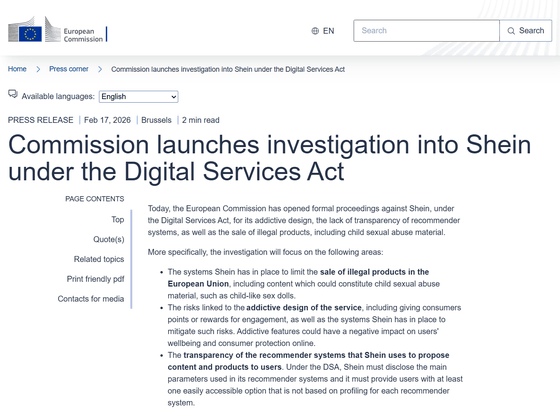現地時間の2026年2月17日、EUの政策執行機関である欧州委員会(EC)が、デジタルサービス法(DSA)に基づきSHEINに対する調査を開始しました。SHEINは「中毒性のあるデザイン」「オススメシステムにおける透明性の欠如」「児童性的虐待素材を含む違法商品の販売」を理由に調査されます。