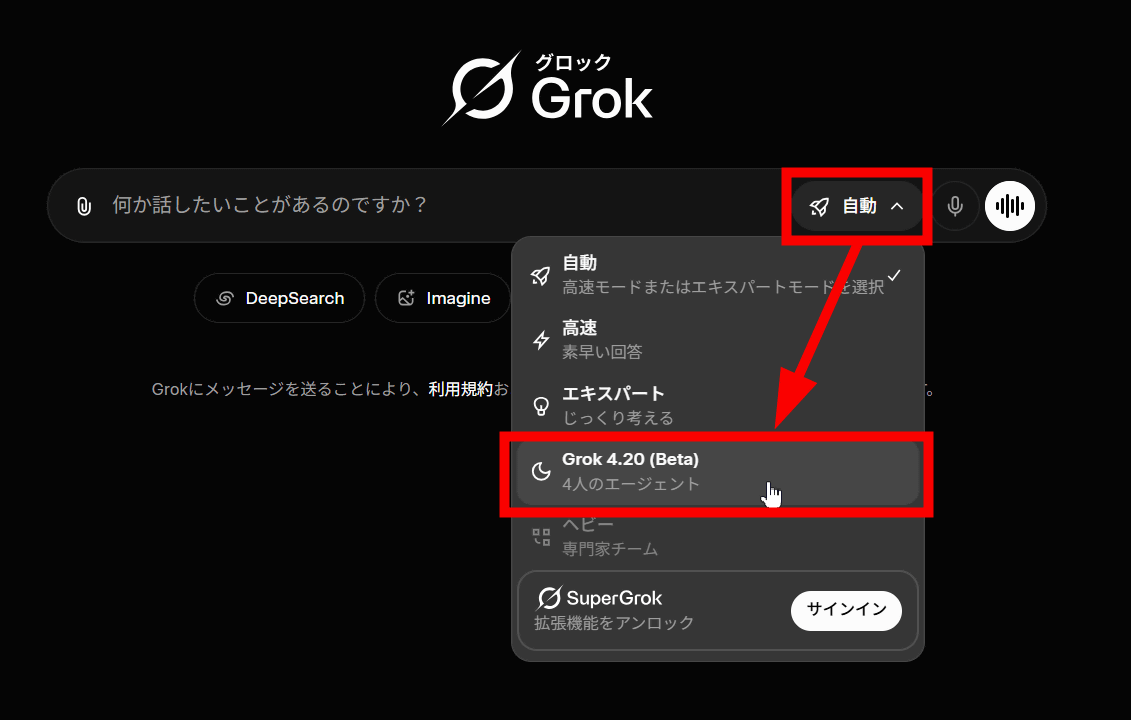 Grok 4.2のパブリックベータ版はすでに利用可能です。ブラウザ版の場合、「自動」をクリックして「Grok 4.20(Beta)」をクリックすればOK。