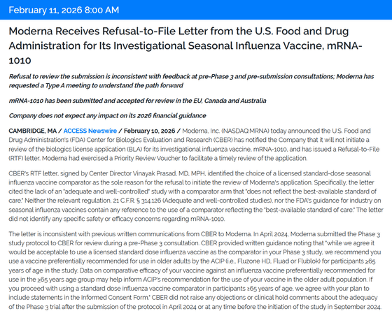 現地時間の2026年2月11日、モデルナは季節性インフルエンザワクチン「mRNA-1010」の治験のために生物学的製剤承認申請をFDAに行なったところ、これを拒否されたことを明かしました。FDAはモデルナの第3相試験の設計が審査拒否の理由と説明していますが、mRNA-1010はすでにEU、カナダ、オーストラリアで同様の申請を受理されており、申請前に行なわれた協議でのフィードバックと矛盾しているとして、審査拒否は予想外の出来事であったことを明かしています。