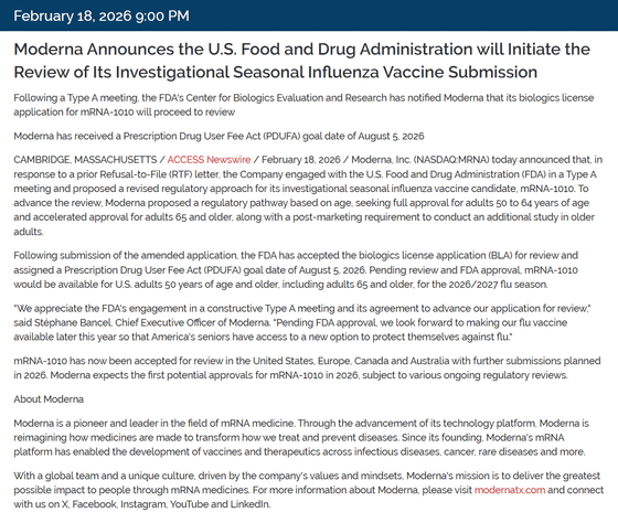 しかし、現地時間の2026年2月18日、モデルナはFDAがmRNA-1010の生物学的製剤承認申請の審査を進めると通知してきたことを明かしました。モデルナはFDAの審査拒否に対して協議を行い、審査拒否の見直しに同意してもらうことができたと説明しています。