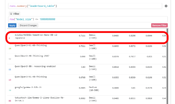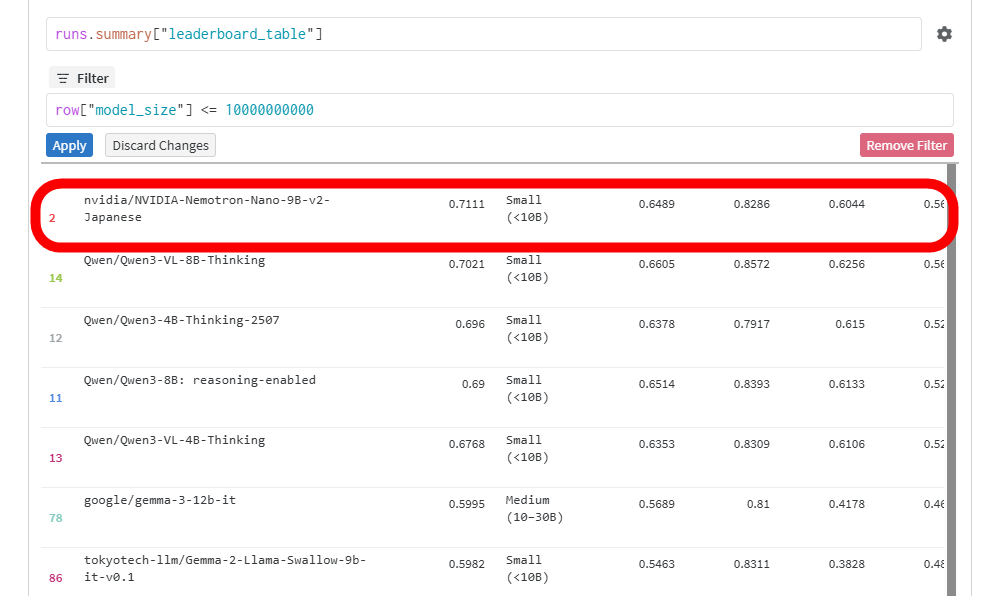 AIモデルの日本語性能測定結果を集積しているNejumi Leaderboard(ねじゅみリーダーボード)で100億パラメータ以下のモデルに絞ったランキングが以下。Nemotron-Nano-9B-v2-JapaneseはQwen3-8BやGemma-3-12b-itといったモデルを抑えてトップスコアを記録しています。