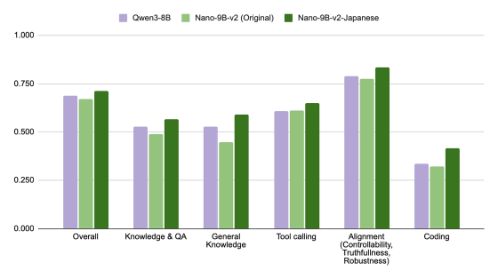 「Qwen3-8B」「Nemotron-Nano-9B-v2」「Nemotron-Nano-9B-v2-Japanese」のカテゴリごとの性能をまとめたグラフが以下。Nemotron-Nano-9B-v2-Japaneseは知識テストやコーディングテストでベースモデルや競合モデルを上回っています。