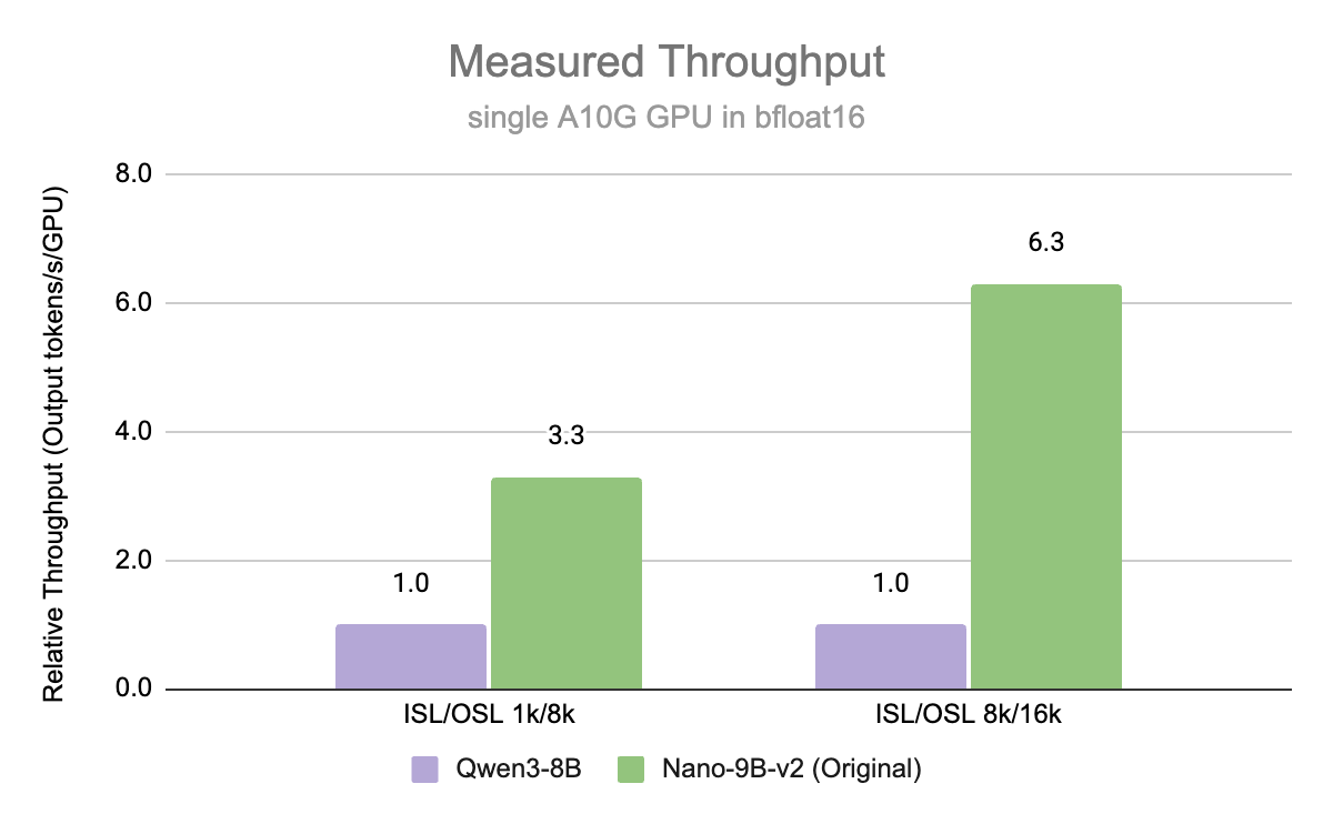 Nemotron-Nano-9B-v2-Japaneseは高速な処理が可能なことも特徴で、NVIDIAが実行したテストではQwen3-8Bと比べて最大6倍の速度を記録しています。