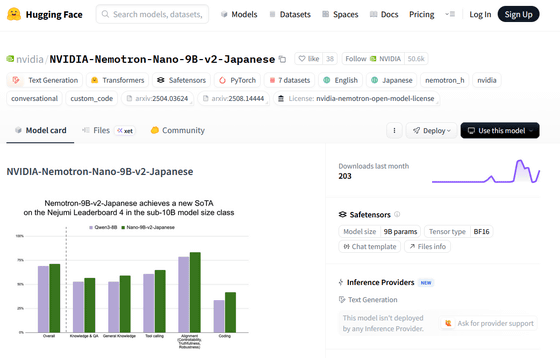 Nemotron-Nano-9B-v2-Japaneseのモデルデータは以下のリンク先で公開されています。ライセンスは商用利用可能な「NVIDIA Nemotron Open Model License」です。