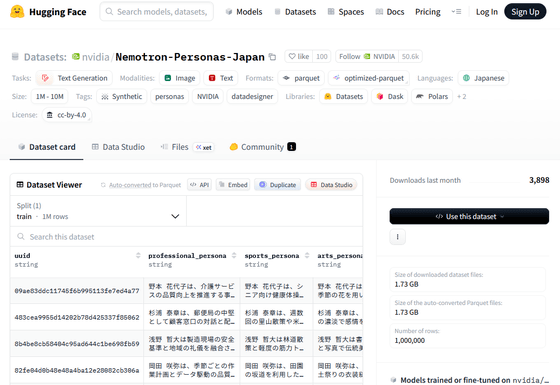 また、日本語データセットのNemotron-Personas-Japanも以下のリンク先で公開されています。ライセンスは「Creative Commons Attribution 4.0 International」です。