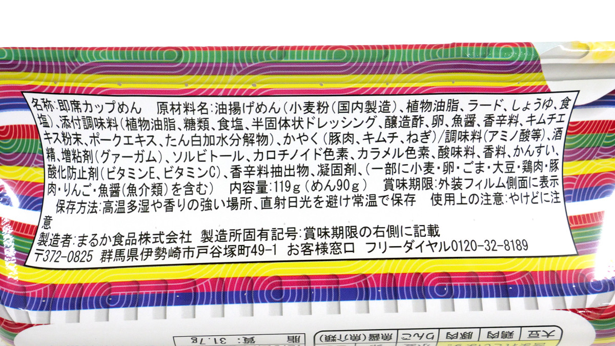 原材料をみると、添付調味料(ソース)にキムチエキス粉末やポークエキスが入っていることや、かやくに豚肉が含まれていることが分かります。