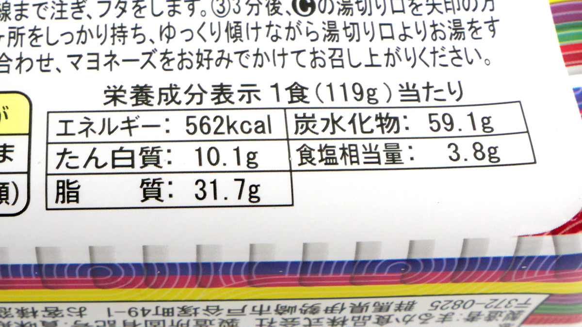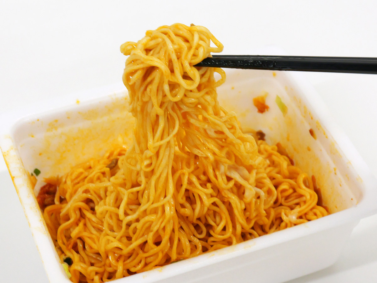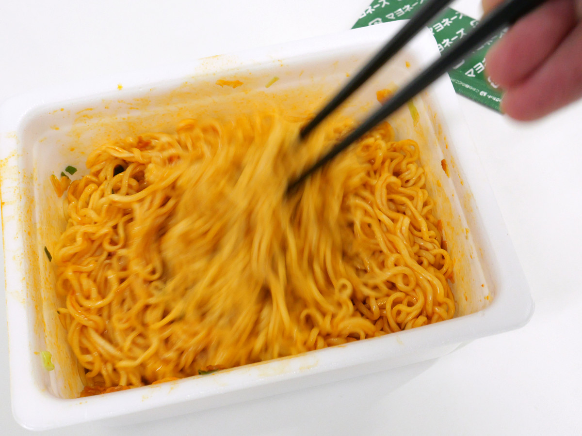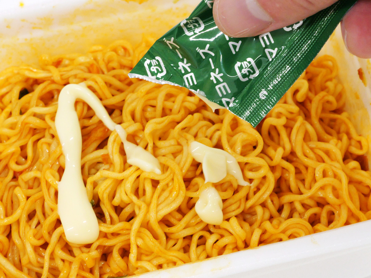 かやくの豚肉は少なめですが、ソースに豚肉の味が含まれていて、麺全体が豚肉の味やキムチのピリ辛さに包まれています。口の中が痛くなるような辛さではなく、食欲をそそるピリピリした刺激が長続きする感じ。かやくに含まれるキムチはシャキシャキした食感で、全体的に脂っこい豚キムチのようなガッツリメニューに仕上がっています。ただ、マヨネーズの味は控えめなので、マヨネーズ愛好家は追いマヨネーズを投入するといいでしょう。