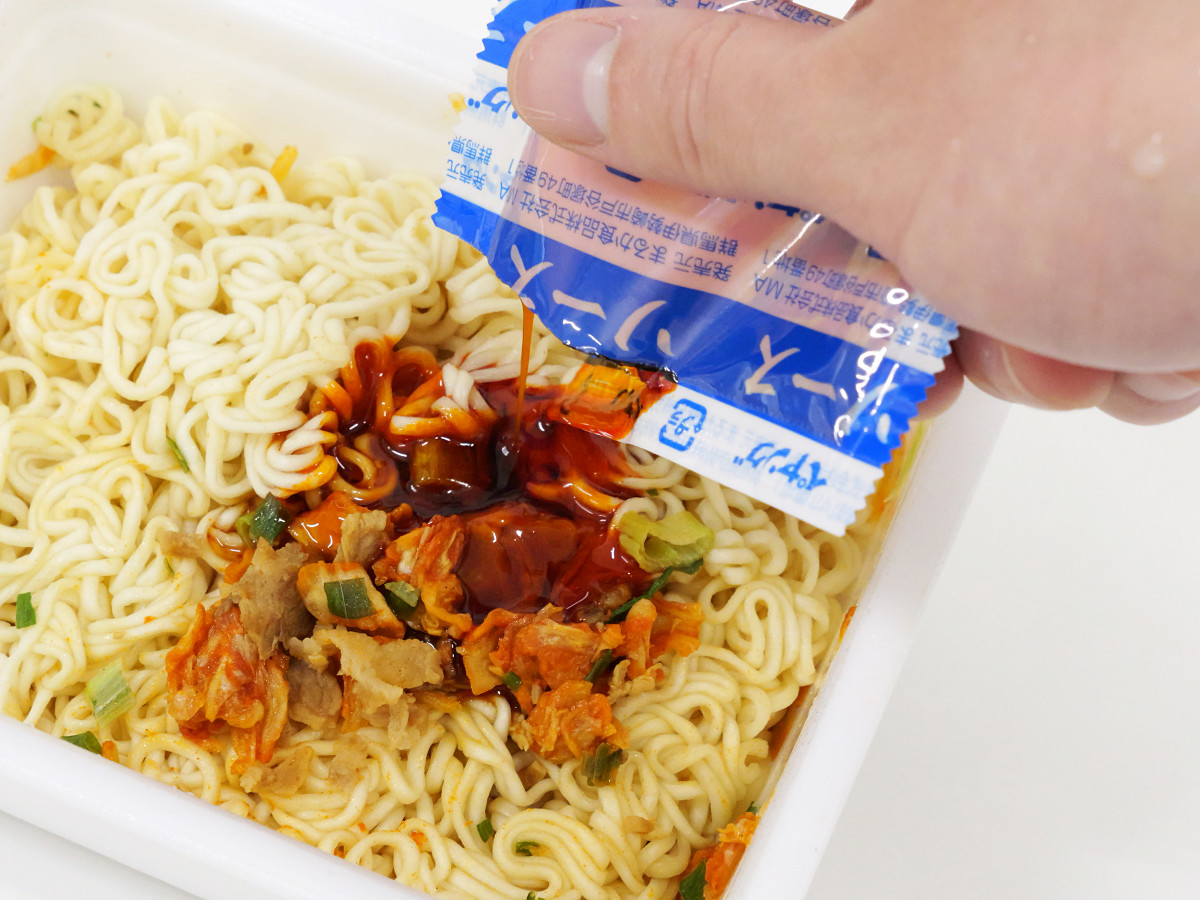ソースを投入。ソースは赤色で、この時点で豚キムチのような食欲をそそる香りが漂ってきます。