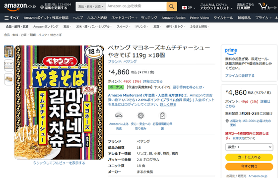 ペヤング マヨネーズキムチチャーシューやきそばの希望小売価格は税別250円で、Amazon.co.jpでは18食セットが税込4860円(1食当たり270円)で売られています。