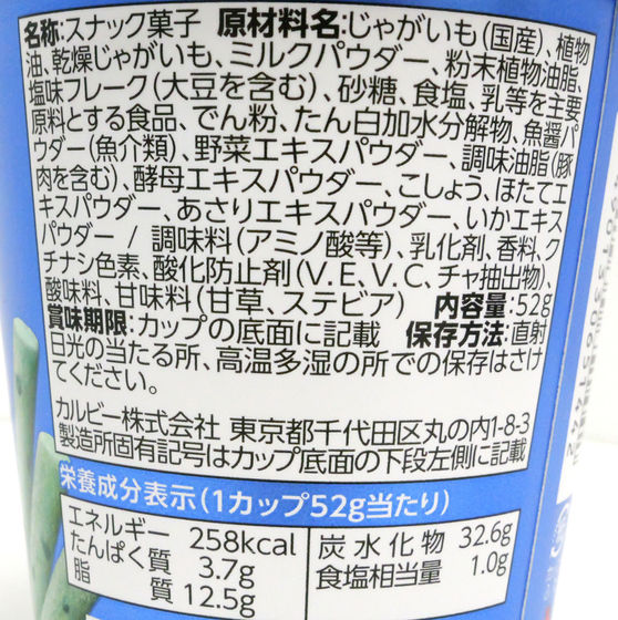 原材料はじゃがいも、魚醤パウダー、野菜エキスパウダー、ほたてエキスパウダーなど。カロリーは258kcalです。